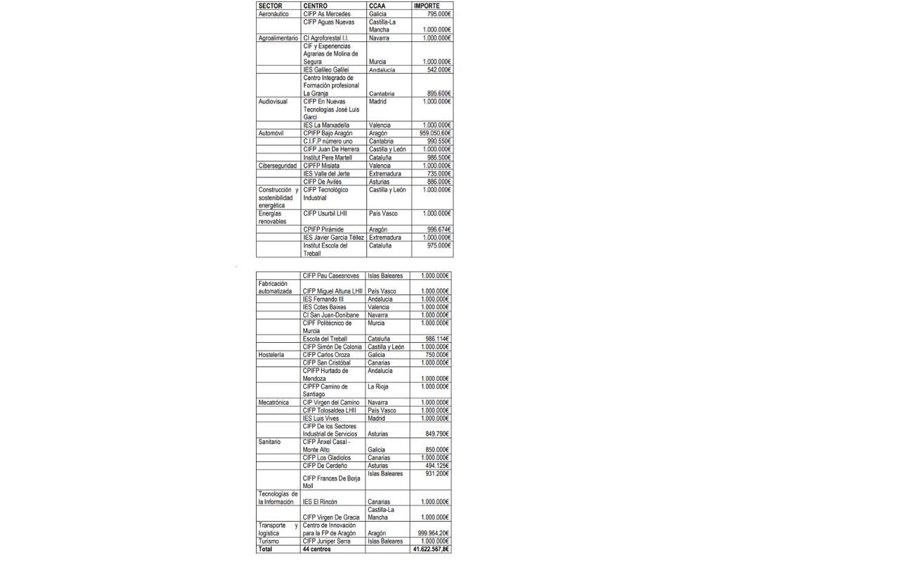 El Ministerio de Educación y Formación Profesional (MEFP) ha seleccionado 44 centros públicos entre los candidatos a la convocatoria de ayudas puesta en marcha el pasado mes de julio para la creación de la red estatal de centros de excelencia de Formación Profesional.