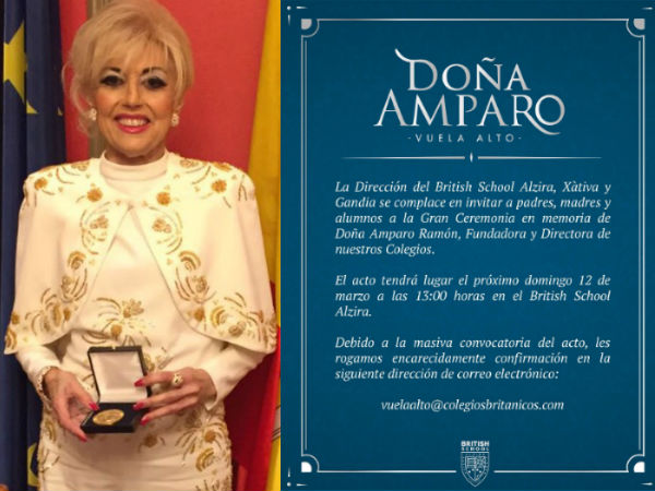 Doña Amparo Ramón Martínez deja un vacío irreemplazable, tanto a nivel profesional y personal. La que fue directora del British School de Alzira, Xátiva y Gandía durante más de 20 años falleció el  pasado 4 de marzo de 2017.