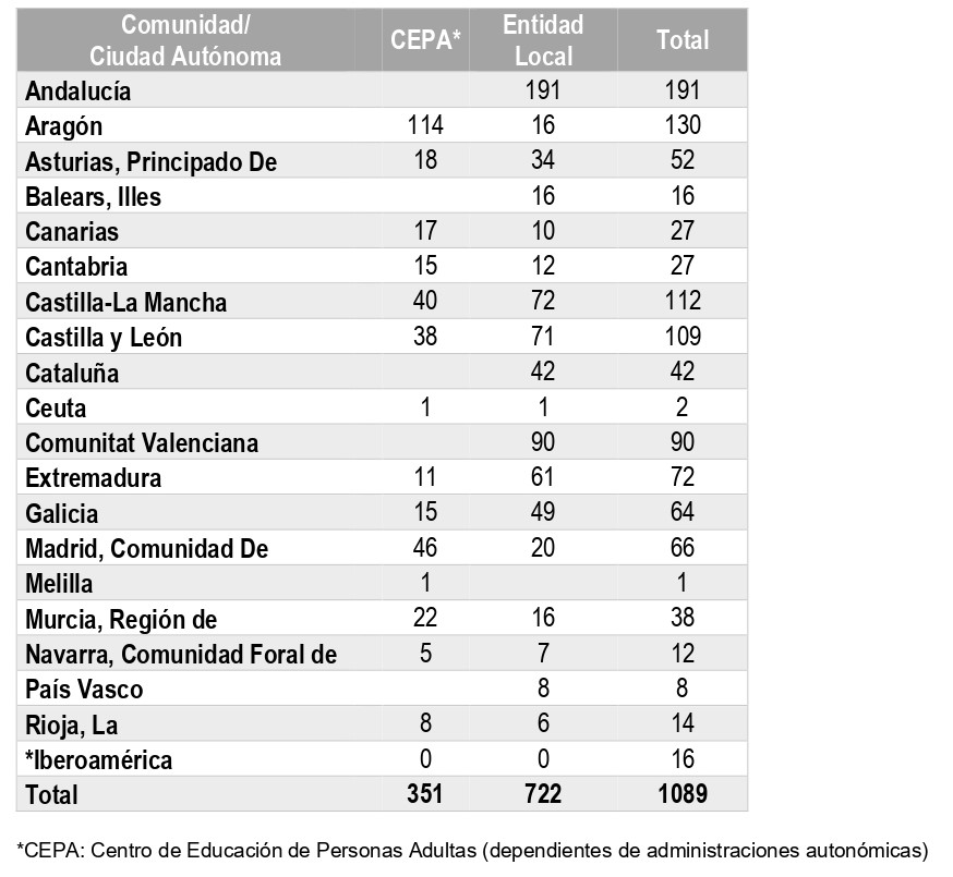 Gracias a estas convocatorias, esta red ha pasado de tener 507 aulas en España (la mayoría –70,8%– dependientes de administraciones autonómicas) a contar con 1.073, 722 de las cuales (un 67,3%) dependen de entidades locales y 351 situadas en centros de educación de personas adultas. A estas hay que sumar 16 aulas ubicadas en Honduras, Nicaragua y Panamá.