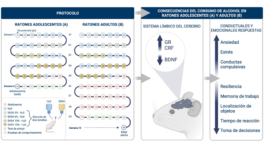 El estudio, llevado a cabo en ratones adolescentes, pretendía analizar los cambios cerebrales y conductuales que supone el consumo prolongado de etanol (o alcohol etílico) en este período, y realizar una comparativa con su etapa adulta. De esta manera, se podrían identificar cambios en la conducta y el cerebro, para comprobar si las consecuencias inmediatas tienen repercusiones en un futuro a largo plazo.