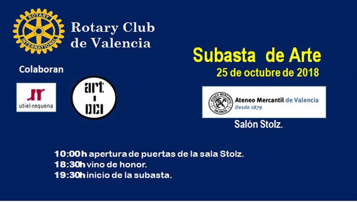 El próximo jueves 25 de octubre tendrá lugar una subasta organizada por el Rotary Club de Valencia en la sala Stolz del Ateneo Mercantil (Plaza del Ayuntamiento 18).