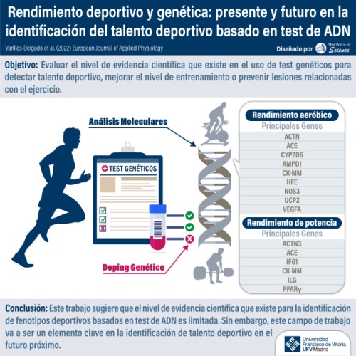 Existen “cerca de 200 polimorfismos genéticos que influyen en los rasgos de rendimiento deportivo, y más de 20 polimorfismos pueden condicionar el estatus del deportista de élite”, comenta el Dr. Varillas. Aun así, el investigador de la UFV señala que “con la evidencia actual, todavía nos encontramos en una etapa temprana para utilizar el genotipado como una herramienta que nos sirva para predecir el rendimiento en el deporte de competición o mejorar los métodos actuales de entrenamiento”.