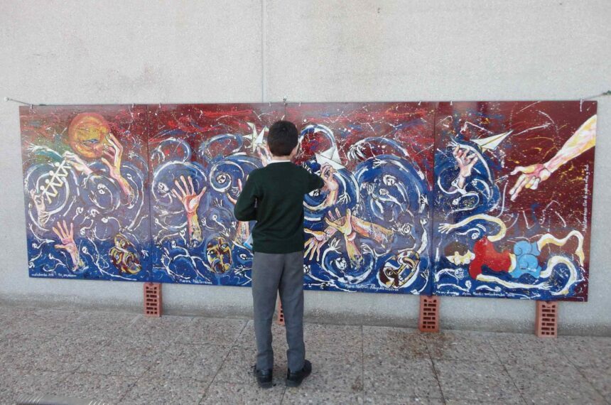 La obra que Vicent Melià ha escogido es ‘Mediterráneo, sepultura de culturas’, que se enmarca en su serie Viaje de Picasso a Siria. La pieza de gran formato alude a la muerte de Aylan Kurdi, el niño sirio ahogado en el Mediterráneo, con múltiples referencias simbólicas. “Esta experiencia es muy interesante. Instintivamente, todos tenemos una visión sobre la Guerra y sobre la Paz. Lo que queremos averiguar es cómo interpretan los niños las imágenes de forma espontánea sin una directriz previa”, explica Melià. Aunque la obra lleva poco tiempo expuesta las primeras impresiones están resultando muy positivas. “Las opiniones que he recabado de los alumnos son increíbles”, señala el ideólogo de este proyecto que se ha propuesto sacar el arte del interior de las salas hasta el patio de los colegios.